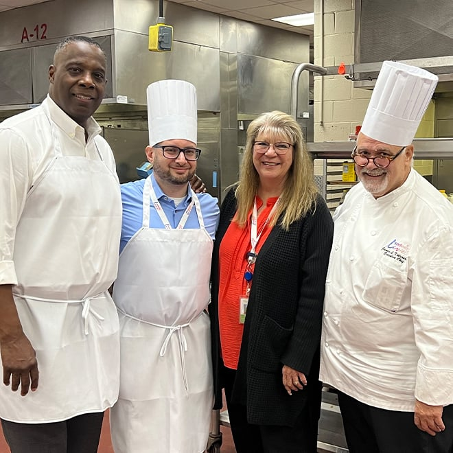 Cornell University’s Hotel Leadership Program recently visited our team at the Orange County Convention Center to get hands-on experience. They have previously visited us at our venues in Las Vegas and Nashville, too. This lineup included two past interns and a new sous chef in Nashville hired out of this program.